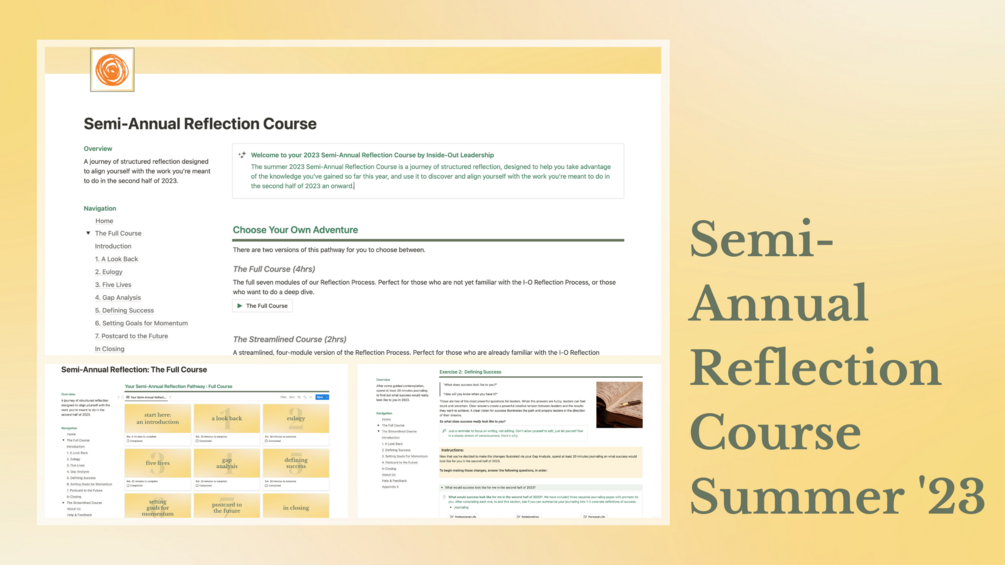 Our Semi-Annual Reflection Course functions as a pathway that you'll follow through distinct exercises tailored to your needs. It will kick off with a choose your own adventure, ensuring your journey of structured reflection is tailored to align yourself with the work you’re meant to do in 2023. It's designed to help you: